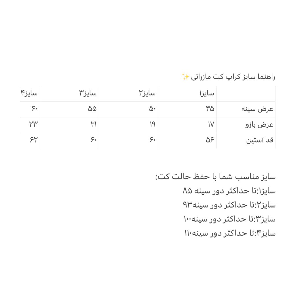 - قبل از انتخاب سایز حتما جدول سایزبندی را با دقت چک کنید